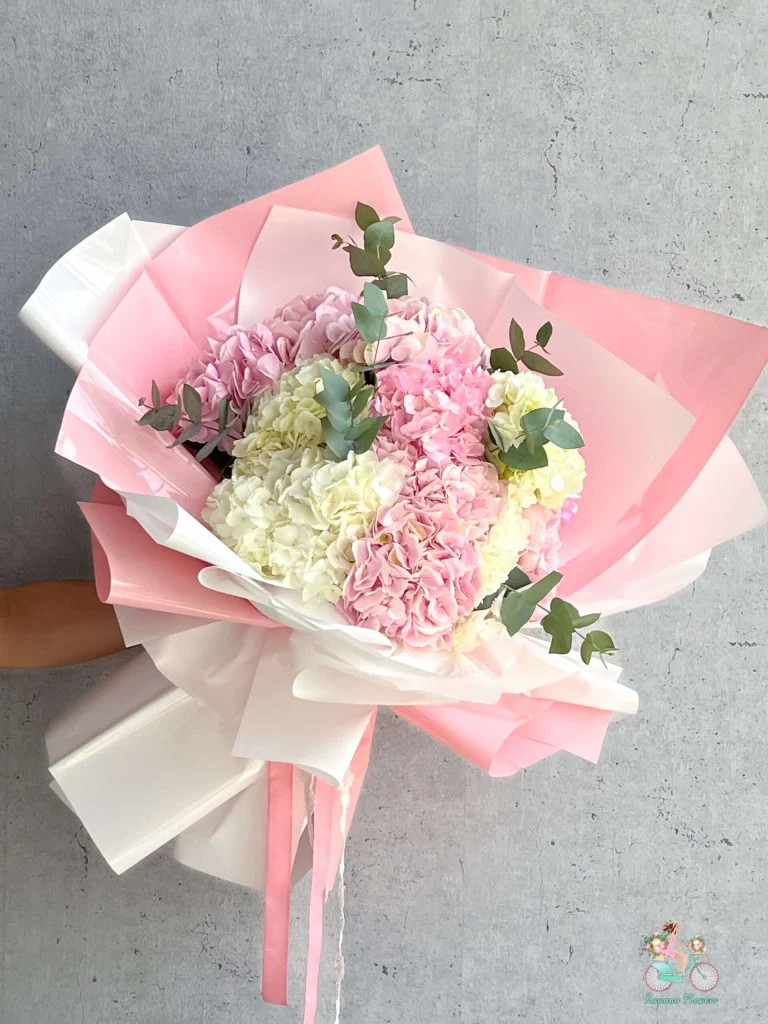 This beautifully hand-tied bouquet features a lush arrangement of blush pink and ivory hydrangeas, carefully styled to create a full, cloud-like silhouette. Accented with fresh eucalyptus foliage for a natural touch, the bouquet is wrapped in premium pink and white paper with layered textures and finished with a soft pink ribbon, offering a refined and feminine presentation. Ideal for birthdays, Mother’s Day, baby celebrations, anniversaries, or elegant everyday gifting.