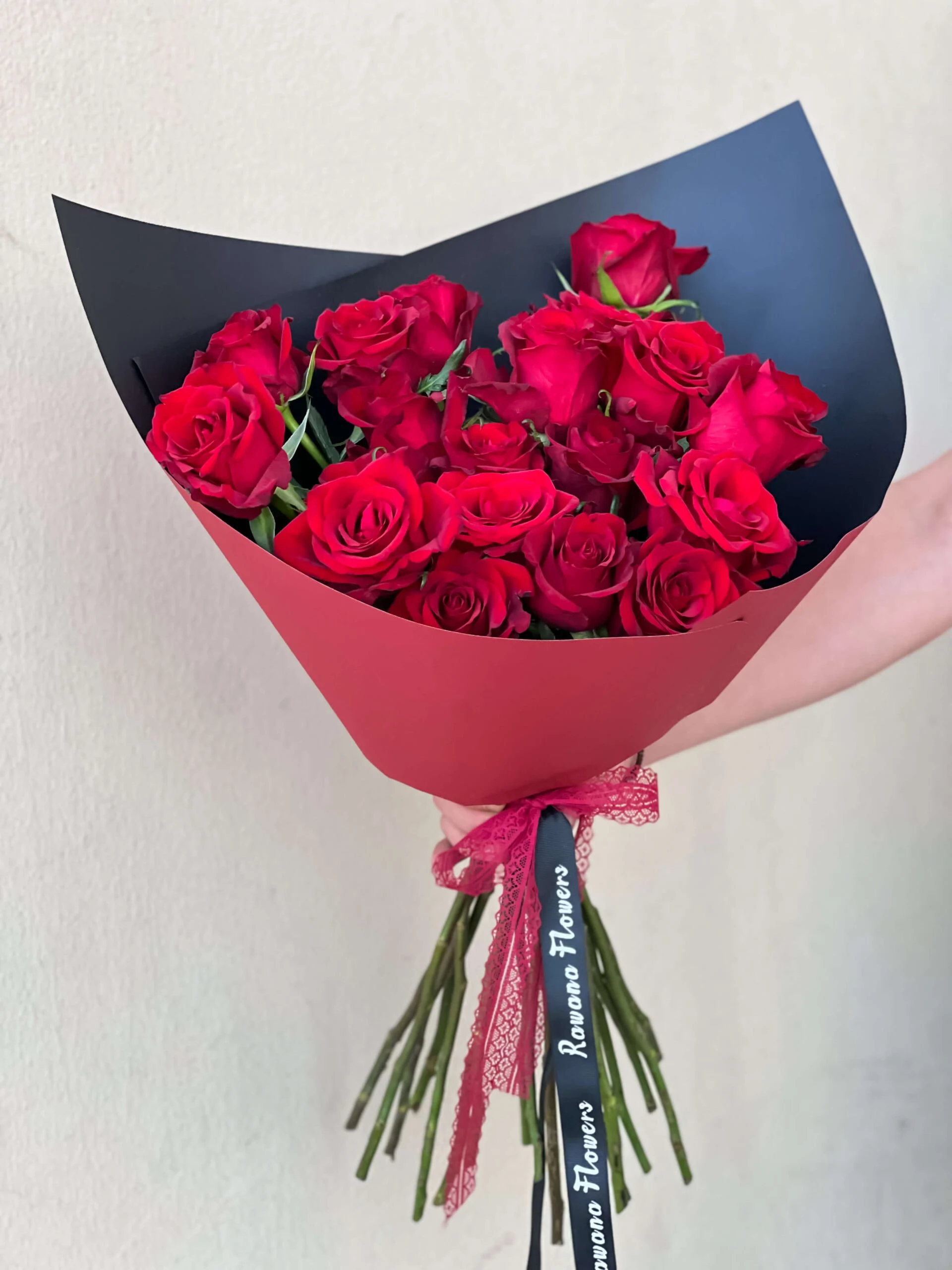 This elegant hand-tied bouquet features premium red roses, carefully selected for their rich color and velvety petals. Arranged in a full, rounded style, the roses are wrapped in a luxury two-tone wrap combining deep red and matte black for a bold, modern contrast. Finished with a branded ribbon detail, this bouquet is perfect for anniversaries, Valentine’s Day, proposals, or meaningful romantic gestures.