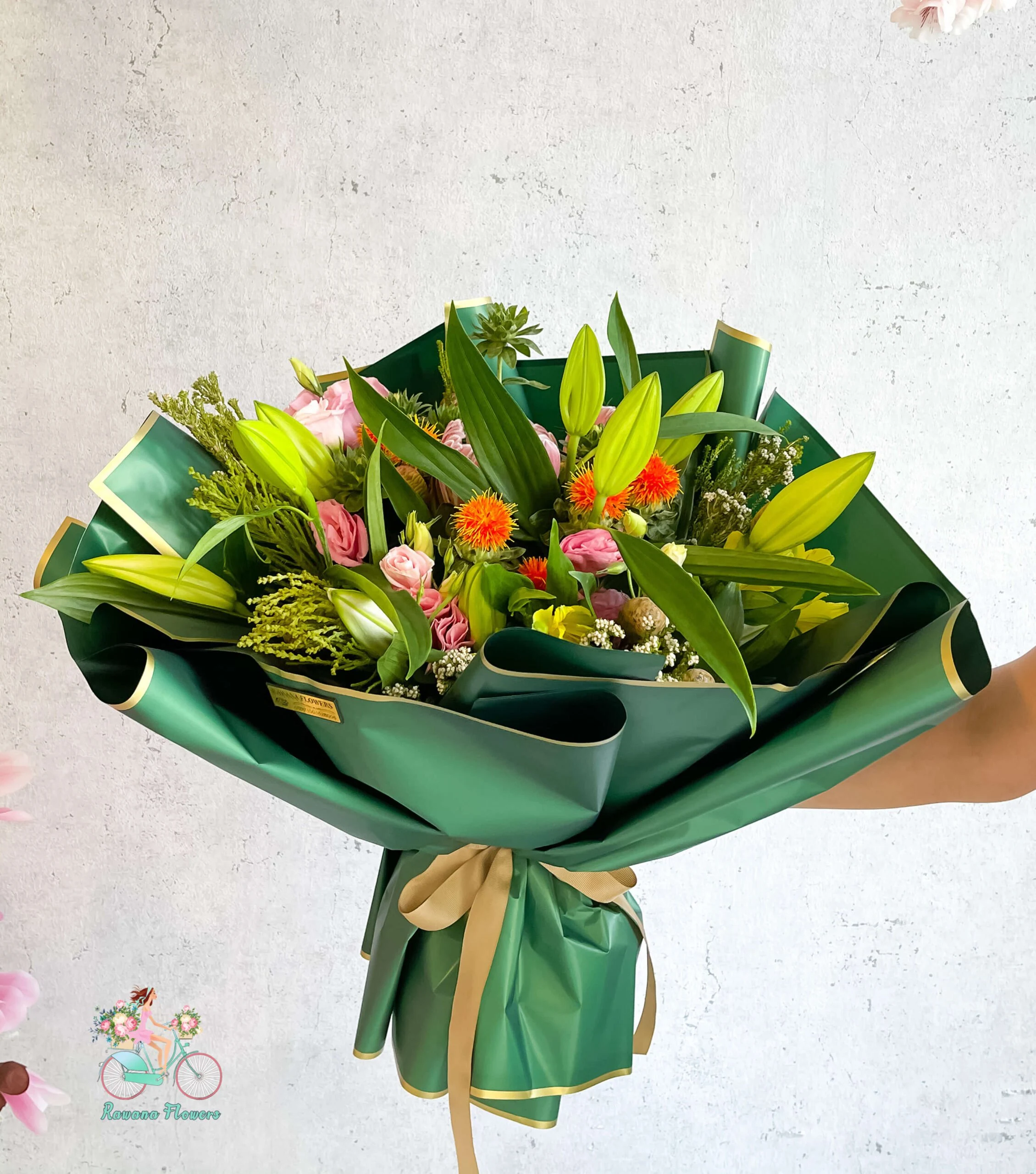 This beautifully hand-tied bouquet features a lively mix of oriental lilies (some in bud form), soft pink roses, and seasonal accent flowers, complemented by rich green foliage for a balanced and organic look. Wrapped in a luxury emerald green paper and finished with a natural ribbon, the bouquet offers a modern yet earthy presentation—perfect for birthdays, congratulations, get-well wishes, or thoughtful everyday gifting.