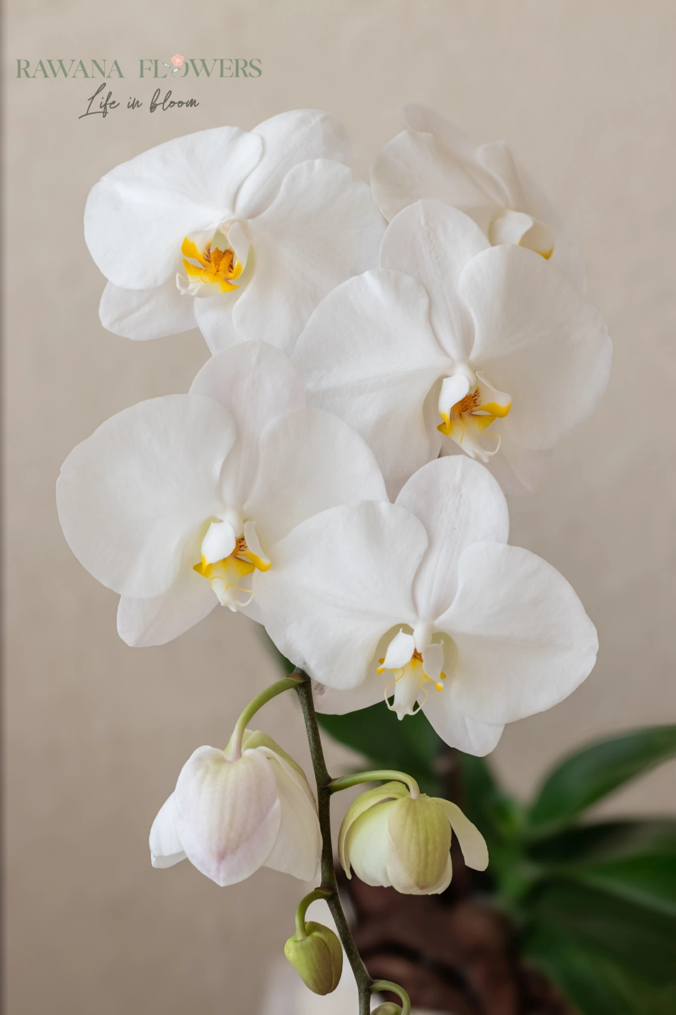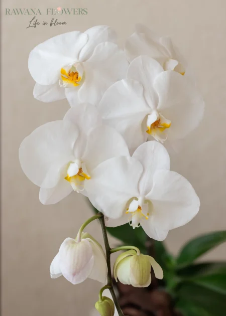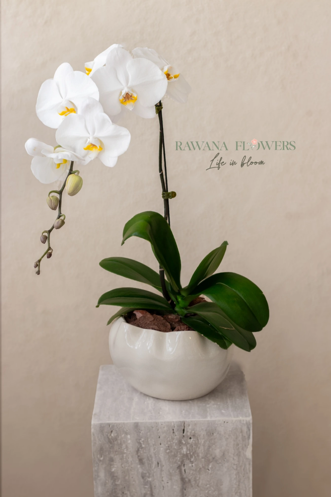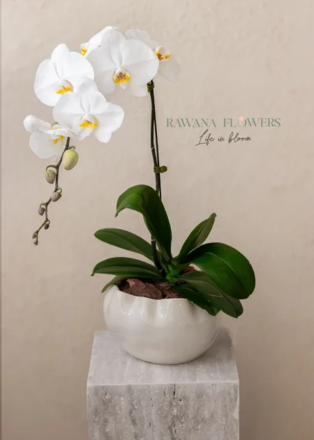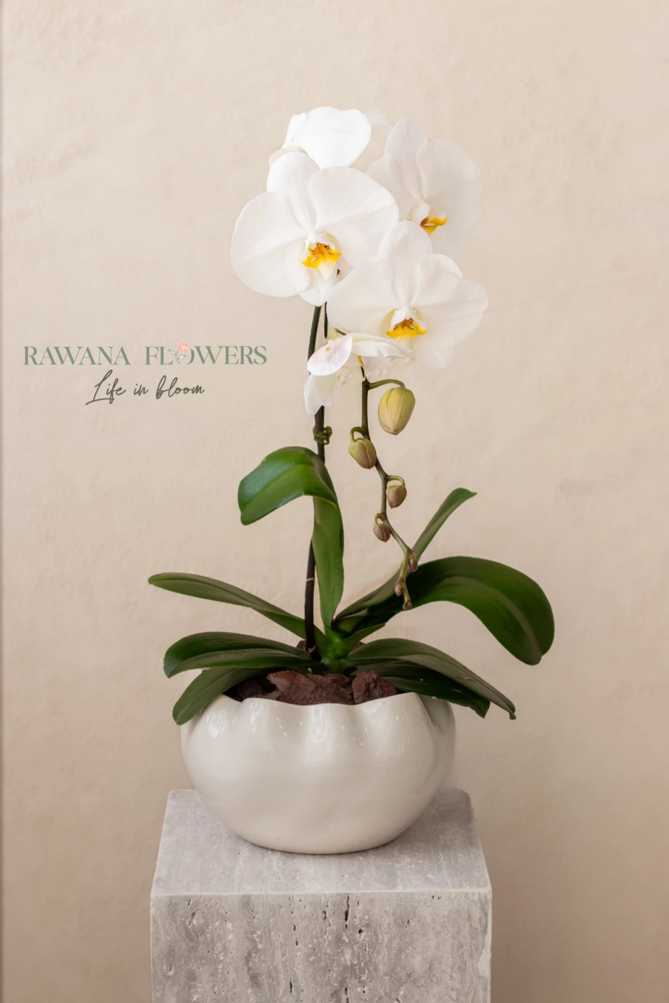 This premium arrangement features a white Phalaenopsis orchid, admired for its velvety petals, delicate yellow centers, and long-lasting blooms. The orchid is beautifully set in a minimalist white ceramic pot, complemented by healthy green leaves and budding stems that promise continued flowering. Perfect for home décor, office spaces, housewarmings, or thoughtful gifting on special occasions.